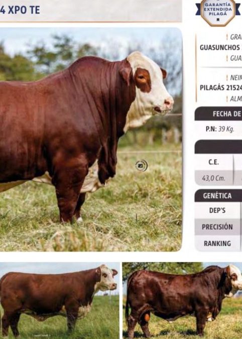 PILAGAS 29735 EXPERTO 21524 XPO TE. Hijo de Guasunchos 3125 Experto y madre Pilagas 21524 XPO c HURLEY TE. Abuela ALMA 3931 C Hurley. Medio Hermano Pilagas 23371 2559 21524 XPO TE. Toro Premium 2020. Pilagas 30743 GUAYCURU 21524 XPO TE. Toro premium 2025. Con su fenotipo, pedigree y DEP, se posiciona como un nuevo gran producto.
